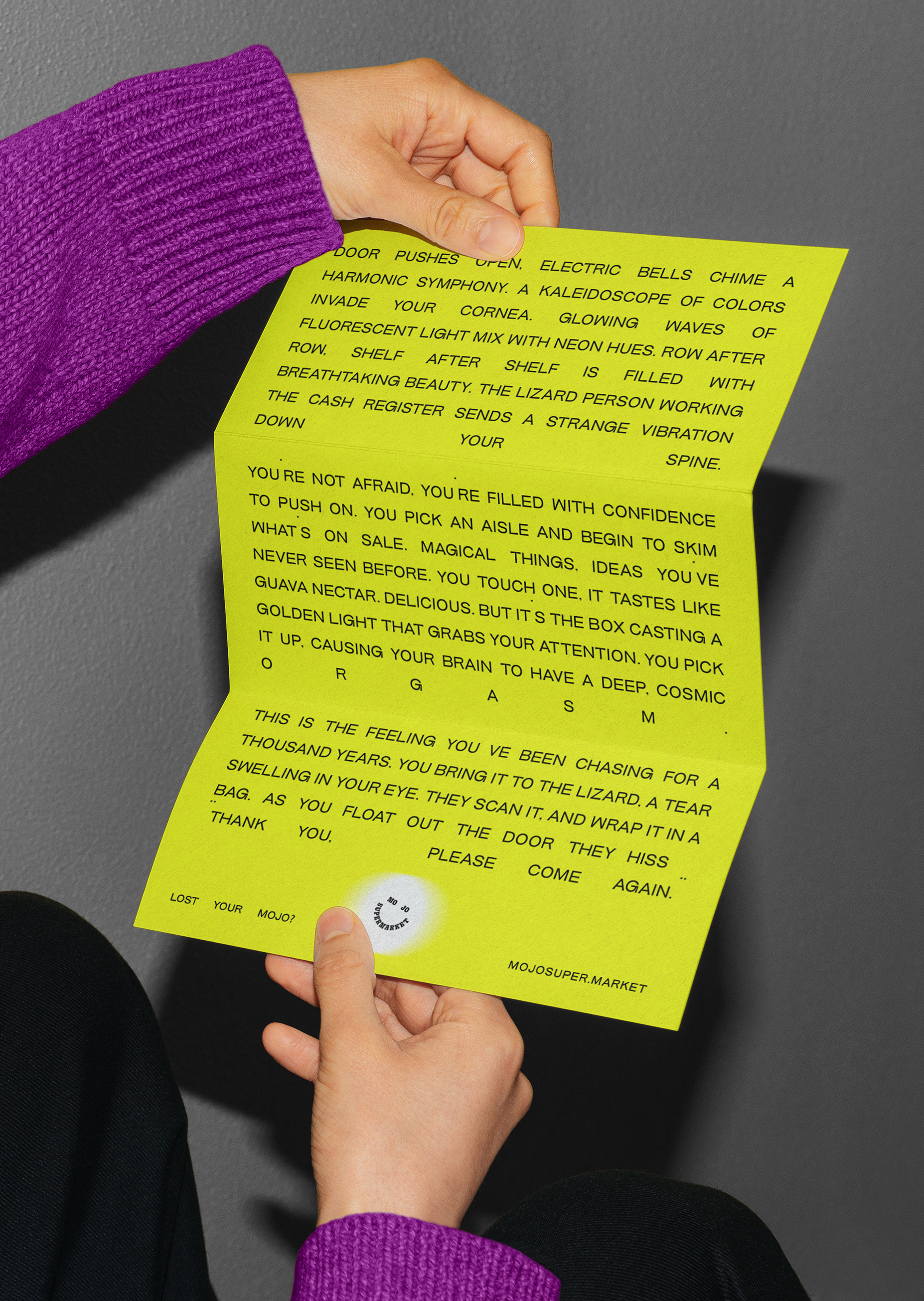 Brand toolkit for breakout creative agency Mojo Supermarket. Mojo Supermarket works with brands to change the cultural conversation and create boundary pushing creative work. The brand toolkit included an expanded design system featuring updated logo, wordmarks, typeface, color palette and usage guidelines—inspired by late night bodega runs, pop and punk.