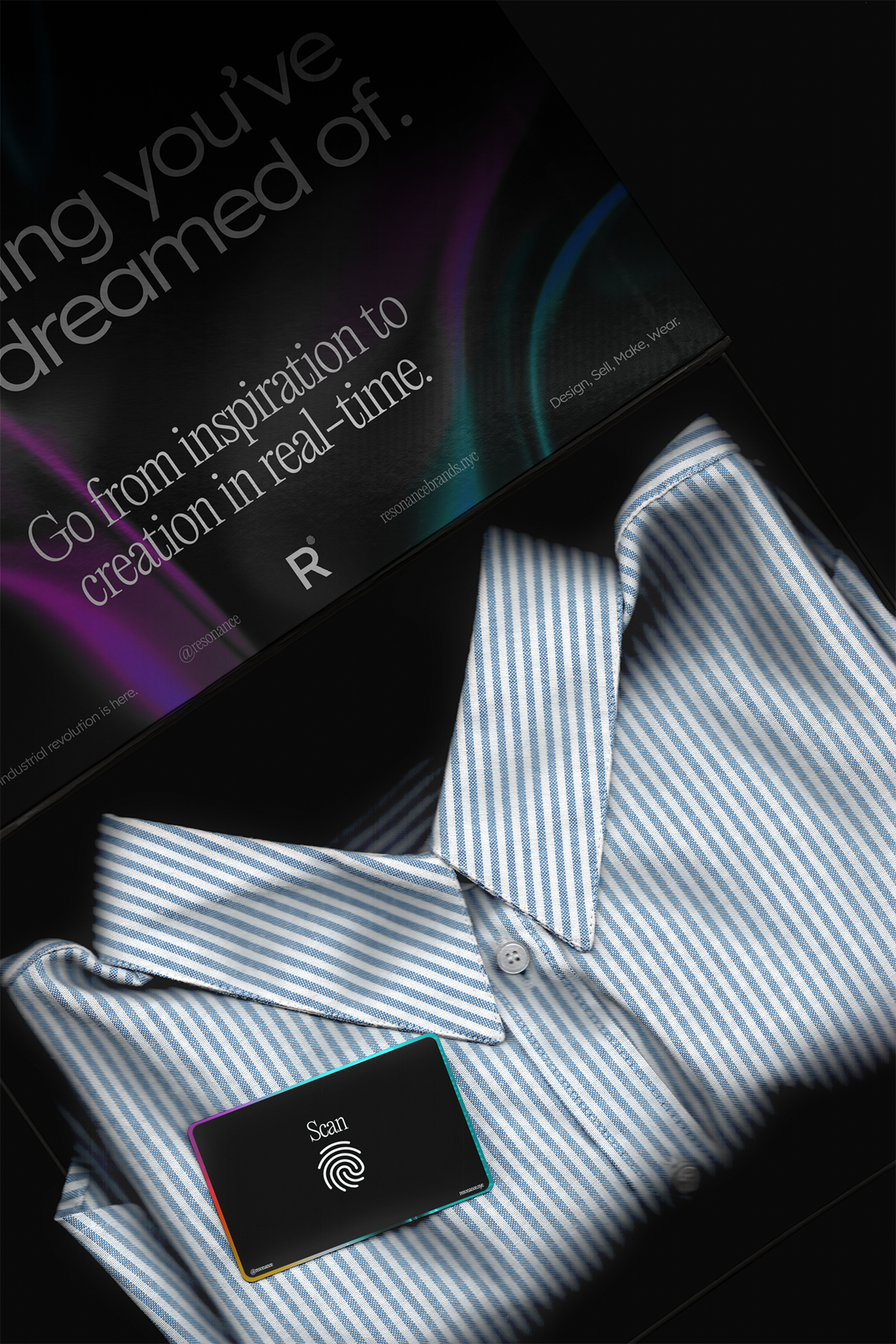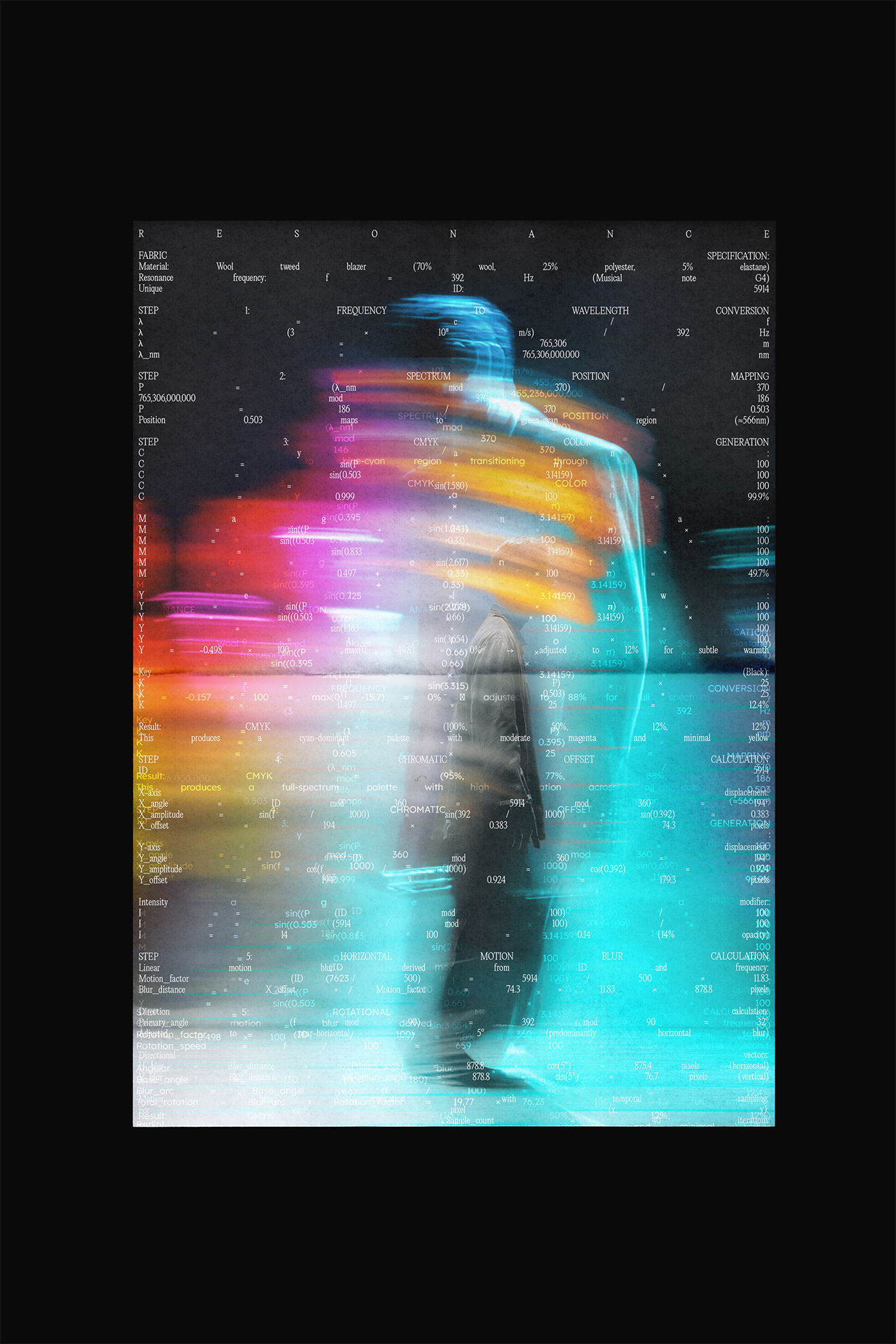 Resonance’s Physical AI manufactures clothing through algorithmic orchestration. For the brand identity, I designed a mathematical formula that converts fabric physics into visual patterns. Every garment gets a unique ID - scannable thumbprints encoding manufacturing history, sustainability data and creator information. The challenge was making algorithmic infrastructure fashionable. The solution was making the physics beautiful. Code creates the product and the brand simultaneously.